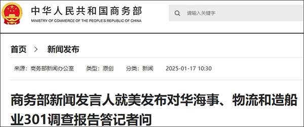 據商務部網站1月17日消息,商務部新聞發言人就美髮布對華海事、物流和造船業301調查報告答記者問。