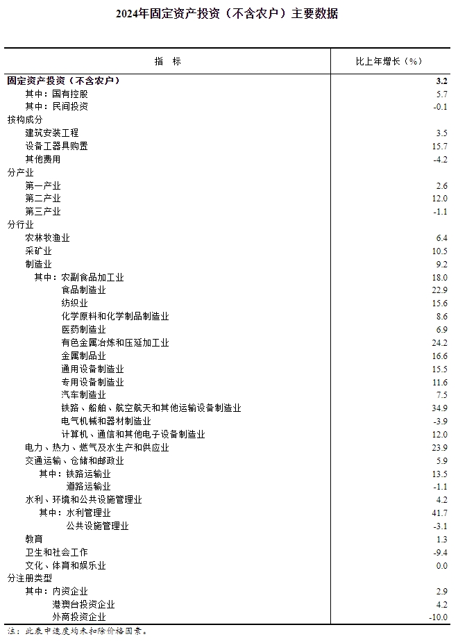 國家統計局:2024年全國固投增長3.2%,外企投資下降10%