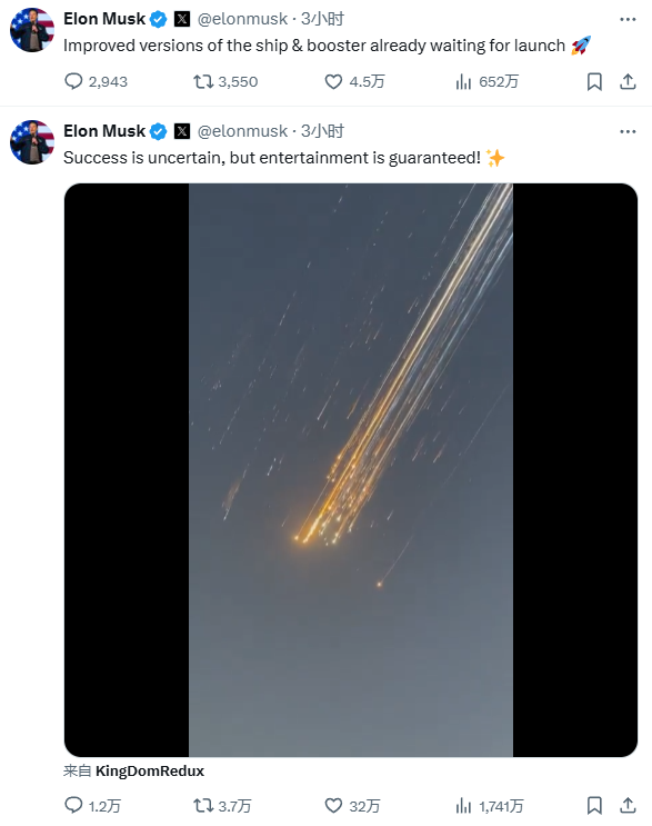 X上網友分享的視頻顯示,加勒比海上空落下了許多碎片,很可能是解體火箭的部分碎片。馬斯克也轉發了火箭碎片的視頻,並表示:“成功是不確定的,但娛樂性是有保證的!”他補充道:“改進版的飛船和助推器已等待發射。”