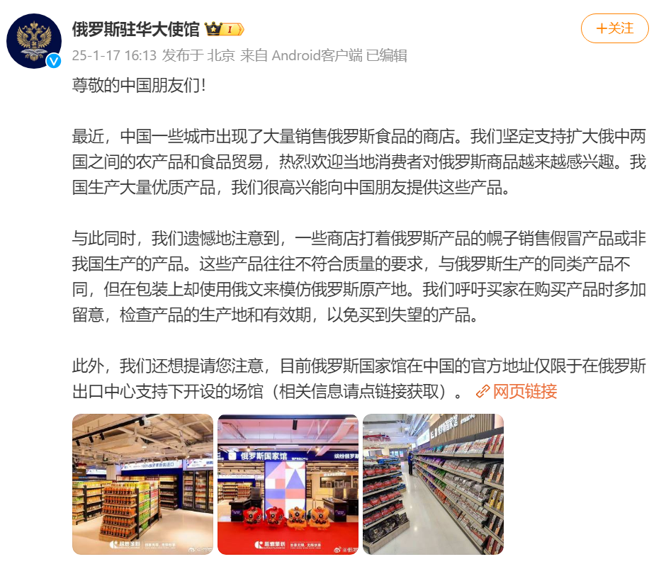 1月17日,俄羅斯駐華大使館在官方微博發文,回應“俄羅斯商品館”相關爭議: