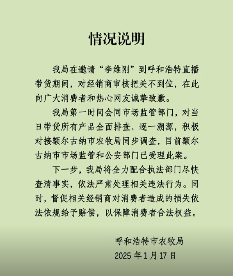 我局在邀請“李維剛”到呼和浩特直播帶貨期間,對經銷商審核把關不到位,在此向廣大消費者和熱心網友誠摯致歉。