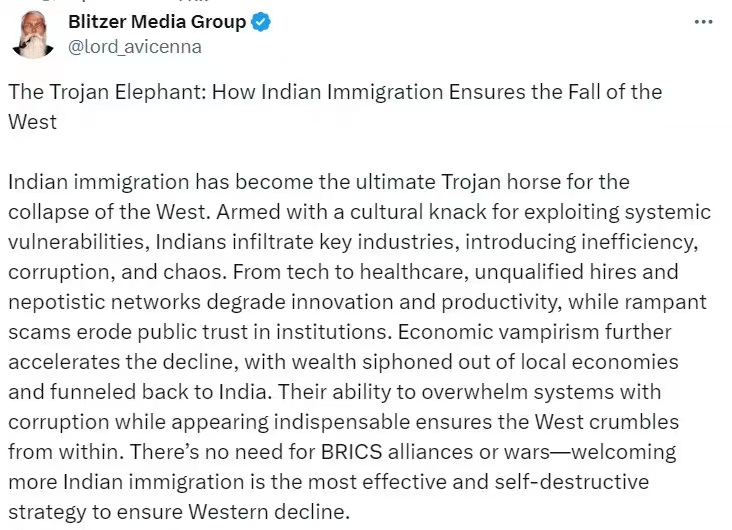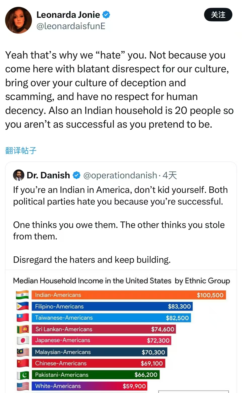 以MAGA為代表的美國社會,遇見中國的超預期衝擊難免震驚煩悶,無明業火正愁無處發泄,現在又被拉馬斯瓦米等印裔揶揄奚落,於是火力全開大肆攻擊印度移民、印度文化,當然也包括印度這個國家。