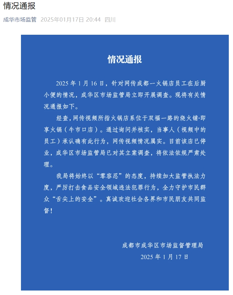 通報稱,2025年1月16日,針對網傳成都一火鍋店員工在後廚小便的情況,成華區市場監管局開展調查。經查,網傳視頻所指火鍋店系位於雙福一路的燒火鋪·即享火鍋(牛市口店)。通過詢問並核實,當事人(視頻中的員工)承認確有此行為,網傳視頻情況屬實。目前該店已停業,成華區市場監管局已對其立案調查,將依法依規嚴肅處置。