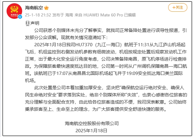 2025年1月18日我司HU7370(九江—海口)航班於11:31從九江廬山機場起飛後,機組監控到右側發動機參數有細微波動,機組按規定處置後觀察發動機工作正常,出於最大化安全運行角度考慮,公司決策備降南昌,原飛機停場進行檢查排故。為保障旅客最快速度抵達目的地,公司第一時間從廣州調機保障南昌—海口航班。該航班已於17:07從南昌昌北國際機場起飛並於19:09安全抵達海口美蘭國際機場。