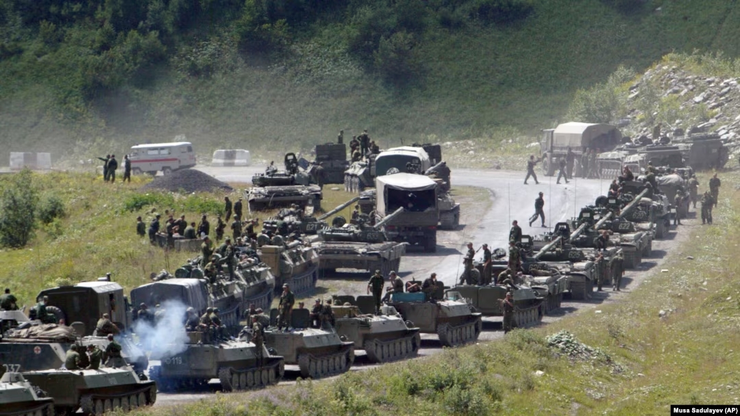 2008年8月7日,正向南奧塞梯首府茨欣瓦利開進的俄軍裝甲縱隊 資料圖
