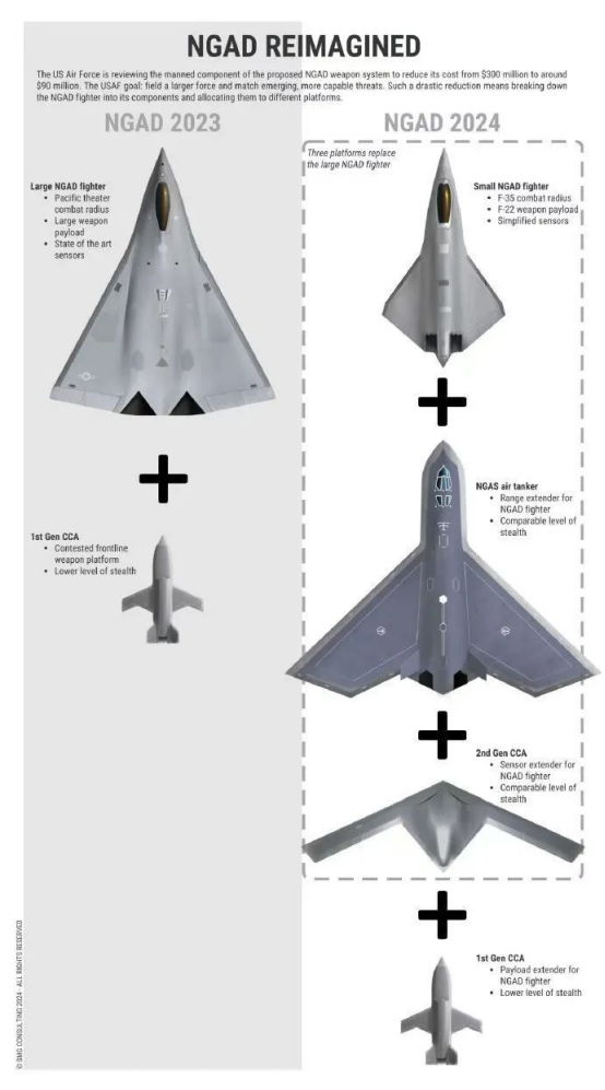 而NGAD項目的優先考慮的依然是可負擔性,對於美國空軍而言,面臨的問題首先是這種飛機能夠大量製造——美國空軍承擔不了用3億美元一架的“大NGAD”去替換整個老化的機隊,反倒類似F-35的多用途飛機反而更合適。除了大飛機以外,而美國空軍還擔憂新飛機的生存性——如果一架造價幾億美元的六代機被一發幾千萬人民幣的遠程精導摧毀在有限的大型基地裏,顯然得不償失。