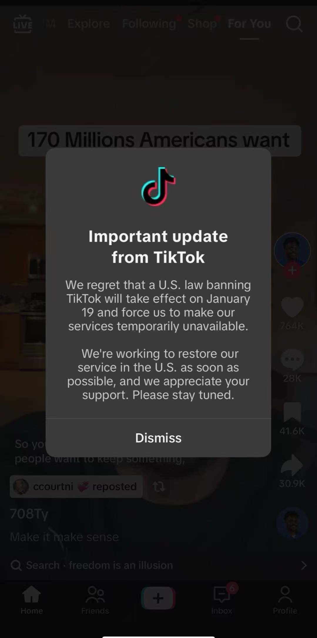 提示稱:“我們很遺憾,一項封禁TikTok的美國法律將於1月19日生效,並迫使我們暫時停止提供服務。我們正儘快努力在美國恢復我們的服務,我們感謝各位的支持。請保持關注。”
