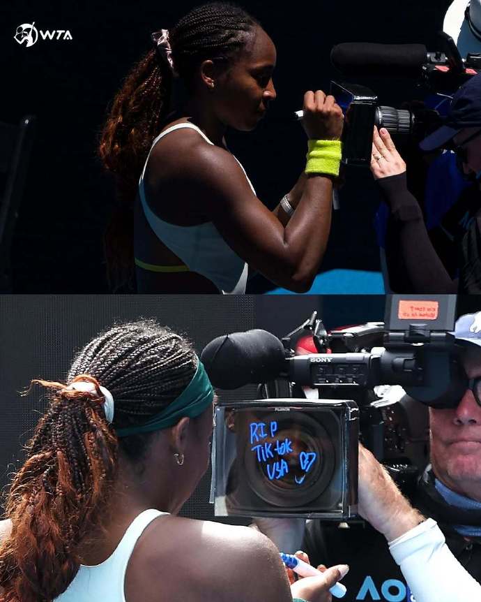 1月19日,澳網2025女單第四輪,美國網球名將、3號種子高芙晉級八強後,在鏡頭上寫道:RIP Tiktok USA(安息吧,美國TikTok),並畫了一顆破碎的心。