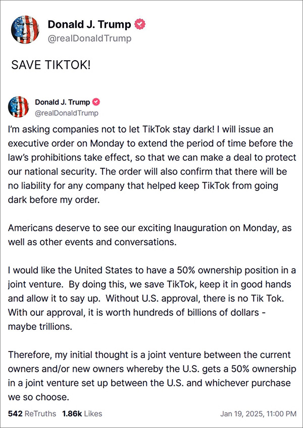 北京時間1月19日夜,即將上任美國總統的特朗普在他自創的社交平台“真實社交”上發佈兩則推文。