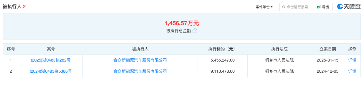 從2024年12月5日到2025年1月15日,合眾汽車兩次被強制執行的金額合計為1456.5725萬元。
