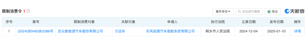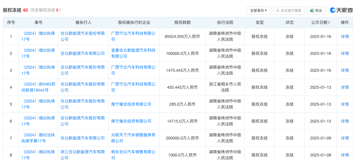 根據天眼查的信息,2024年11月13日至2025年1月20日,合眾汽車共有40條股權凍結記錄,股權數額合計約為41.54億元。