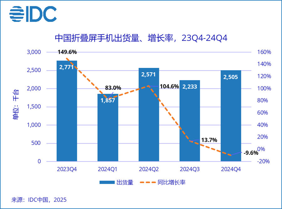 2024年第四季度,中國摺疊屏手機出貨量達到250萬台,在連續9個季度的高速增長之後,首次同比下降9.6%。雖然在輕薄、續航、影像、摺痕等方面不斷進步,但價格、質量、內部空間等先天劣勢使得摺疊屏手機在使用場景和消費人羣上已經難有更大突破和吸引力。2024年中國摺疊屏手機出貨量約917萬台,同比增長30.8%。預計2025年摺疊屏手機將進入“小年”,更多廠商持觀望態度,將更加保守。