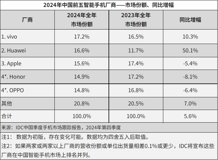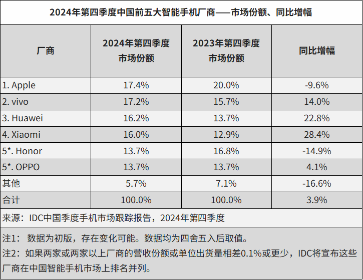 1月20日,市場調研機構IDC發佈的數據顯示,2024年第四季度,中國智能手機市場出貨量約7643萬台,同比增長3.9%。各價位段新品的集中上市以及部分省市開始的新機購買補貼政策推動整體市場延續了之前4個季度的增長趨勢。vivo、華為和小米等廠商的強勢表現幫助Android市場增幅超過7%;但是iPhone16系列銷售難有起色,使得iOS市場繼續同比下降。