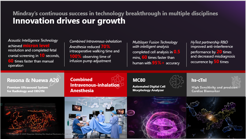 當前,圍繞“數智化創新”、“拓展耗材業務”以及“加速全球化”三大公司中長期發展驅動力,邁瑞醫療正持續以鋭意進取的創新精神和賦能臨牀的解決方案,真正踐行“普及高端科技,讓更多人分享優質生命關懷”的使命,為全球醫療行業的高質量發展貢獻邁瑞方案。