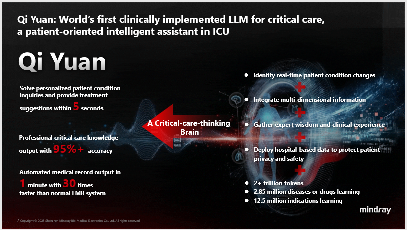 2024年12月,邁瑞醫療推出全球首個在重症監護領域臨牀應用的大模型——“啓元”。藉助物聯網、雲計算、大數據與人工智能技術的深度融合,啓元重症大模型能夠提供準確率高達95%的重症知識查詢結果,基於數據還原患者數字畫像,以重症思維展開深度分析,在5秒內為醫護人員回溯整合患者病情、基於患者數字畫像預測趨勢並提供建議,1分鐘生成臨牀思維導向下的病歷文檔,助力臨牀全面提升診療精準度與質量。