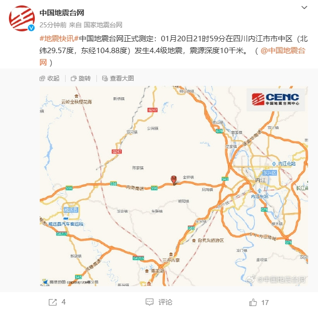 四川內江市市中區發生4.4級地震 guancha 2025-01-20 @中國地震台網 消息,中國地震台網正式測定:01月20日21時59分在四川內江市市中區(北緯29.57度,東經104.88度)發生4.4級地震,震源深度10千米。
