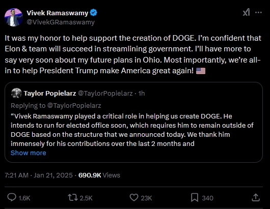 拉馬斯瓦米晚些在馬斯克擁有的社交平台X(原推特)上轉發相關聲明進一步證實了這一消息,並表示他將“很快”公佈自己未來在俄亥俄州的競選計劃。
