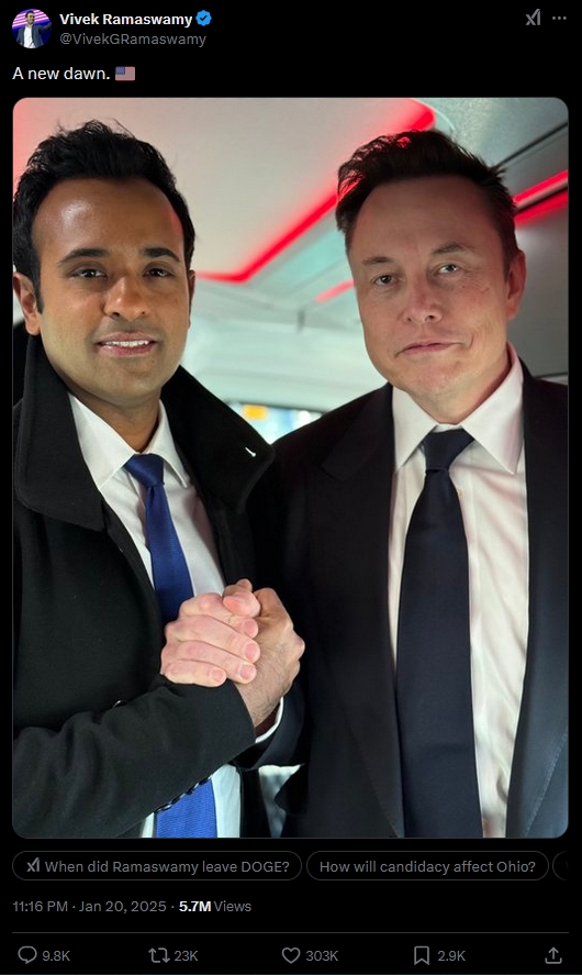 據美聯社1月20日報道,原本被提名與馬斯克共同領導DOGE的美國印度裔企業家維韋克·拉馬斯瓦米被證實已退出DOGE,籌備“競選公職”。拉馬斯瓦米早前就表明有意競選俄亥俄州州長,但美媒近來也傳出風聲説,這名生物科技新貴之所以出走是因為惹惱了不少特朗普的身邊人,尤其是“第一哥們”馬斯克。