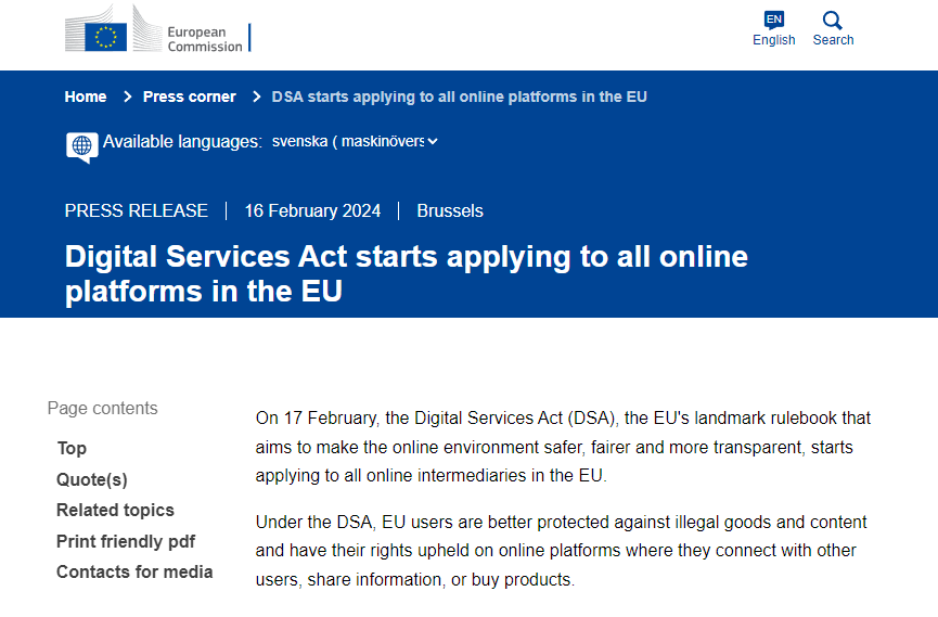 歐盟委員會在2024年2月16日發表公告宣佈,歐盟《數字服務法》(Digital Services Act,DSA)將於17日正式在所有網絡平台生效。該法案涵蓋社交媒體審核、電商廣告推送以及打擊假冒商品等多個方面,旨在確保用户在使用過程中的安全。