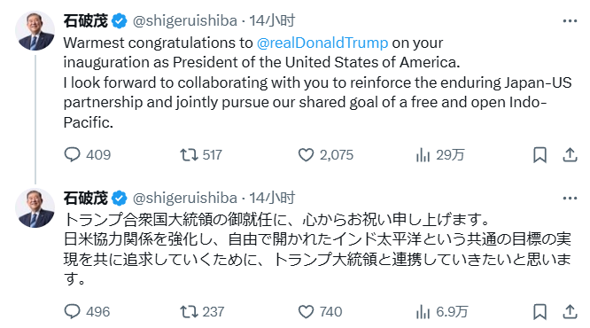 在特朗普就職美國新一任總統後,石破茂便於當地時間21日凌晨2點在社交平台“X”上用日英雙語發帖祝賀:“我衷心祝賀特朗普總統就職。我期待與特朗普總統一起加強日美合作,一起合作追求自由開放的‘印太地區’這一共同的目標。”