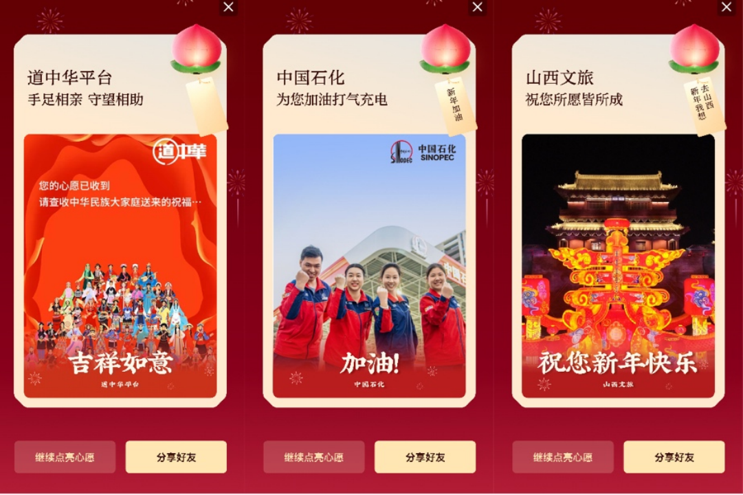 今年,包括國家民委道中華平台、中國警察網、中國石化、各地景區在內的社會各界也都來淘寶上幫助大家實現心願,為全國網友送祝福。黑龍江、甘肅、山西、無錫、黔東南、鄂爾多斯等在內的全國16地文旅將送出各地熱門景點豪華遊;中國石化為大家加油打氣充電,甚至送出一噸油來為你加油;北高峯財神廟也來給大家添點福氣和財氣,把財神迎進門。
