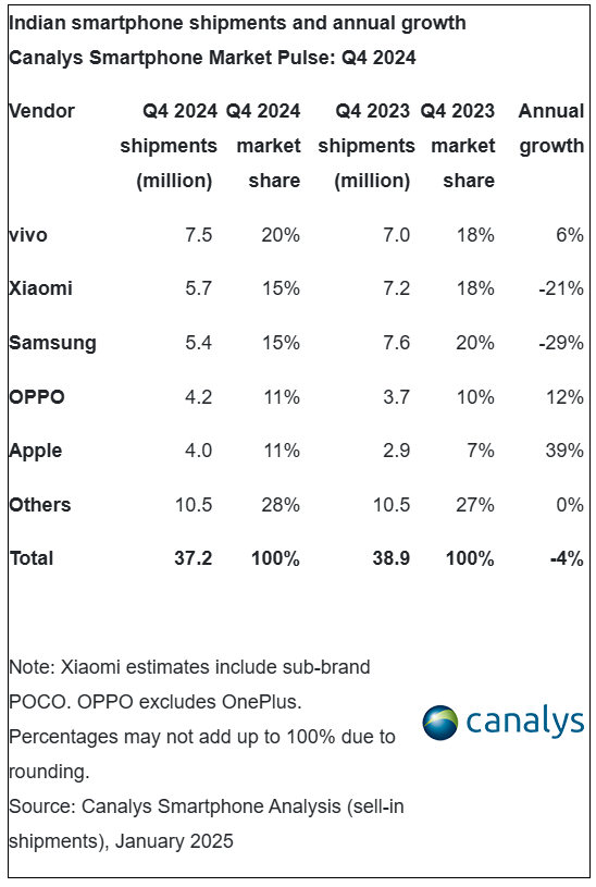 值得注意的是,2024年三星手機出貨量大跌10%,是前五名中跌幅最大的。2024年第四季度,小米和三星在當地的出貨量分別大跌21%和29%,而蘋果在印度的出貨量大增39%,增速領跑前五名。