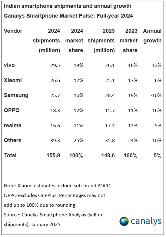在具體排名中,2024年全年,vivo以19%的份額躋身印度第一,小米以17%的份額排名第二,三星以16%的份額排名第三,OPPO以12%的份額排名第四,realme以11%的份額排名第五。