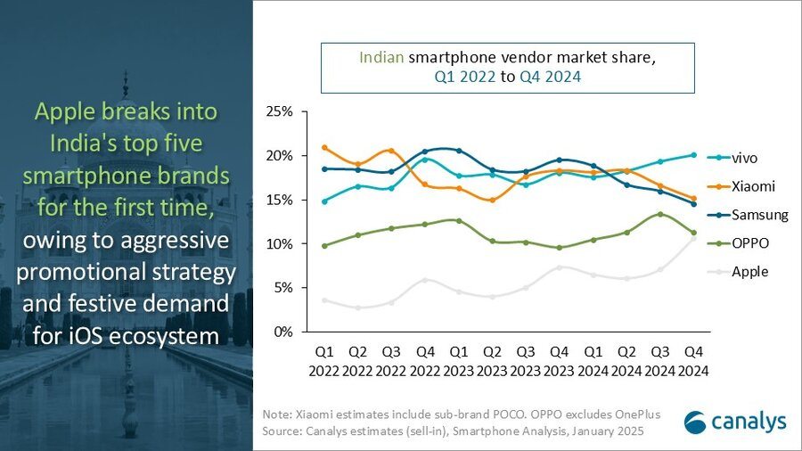 2024年第四季度,vivo以750萬台的出貨量和20%的市場份額穩居首位。小米以570萬台緊隨其後,位居第二。三星以540萬台穩居第三。OPPO(不含一加)和蘋果躋身前五,出貨量分別為420萬和400萬台。在積極促銷和節日需求強勁的推動下,蘋果首次奪得第五名。