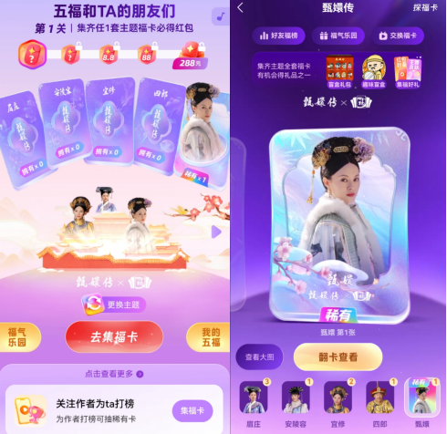 福卡中“稀有卡”也是亮點,其概念與傳統五福中的“敬業福”相似,因其經常成為網友難集的卡,所以其“稀有”的特性就被保留下來。在這次集福的每一個IP主題5張卡中,都有1張卡成為了“稀有卡”,比如《甄嬛傳》主題的稀有卡是“甄嬛”。