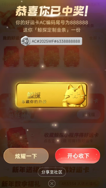 同時,今年多個福卡的右上角有了一個“永久保存福卡”的按鈕,用户點擊後可以定製祝福,並將福卡升級成擁有區塊鏈編碼的數字藏品-鯨探好運卡,永久珍藏。值得一提的是,好運卡的編碼可以參與抽獎。社交媒體信息顯示,集五福活動開放首日,就有江蘇網友通過將福卡轉化成數字藏品抽到了10克金條。