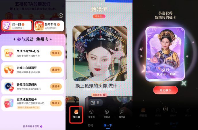 以“甄嬛傳”福卡為例,點擊“掃一掃”選擇“探五福”,對着甄嬛、皇后等人掃描後,都出了幾張不同的甄嬛傳系列裏的福卡。