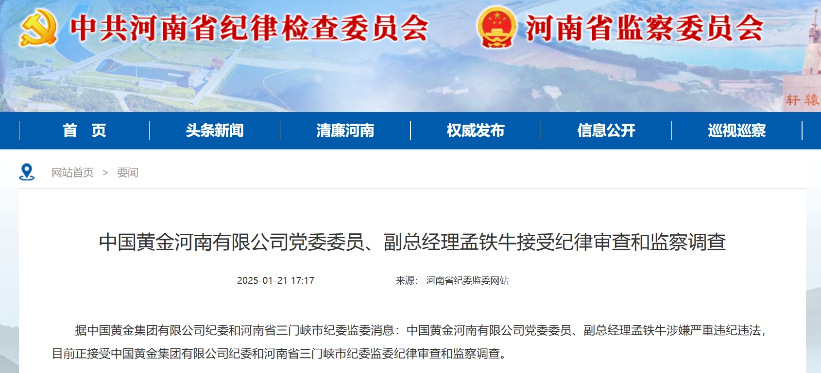 河南省紀委監委網站1月21日發佈,據中國黃金集團有限公司紀委和河南省三門峽市紀委監委消息:中國黃金河南有限公司黨委委員、副總經理孟鐵牛涉嫌嚴重違紀違法,目前正接受中國黃金集團有限公司紀委和河南省三門峽市紀委監委紀律審查和監察調查。