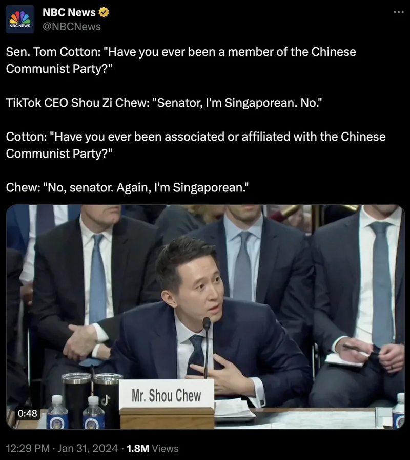我記得TikTok的首席執行官在一次聽證會上一直強調他不是中國人,而是新加坡人。但這些美國人根本不予理會,這真是太愚蠢了。因為TikTok是中國人的應用程序,他們禁止了它,那麼我們的回應就是轉向一個更加“中國”的應用程序作為TikTok的替代。