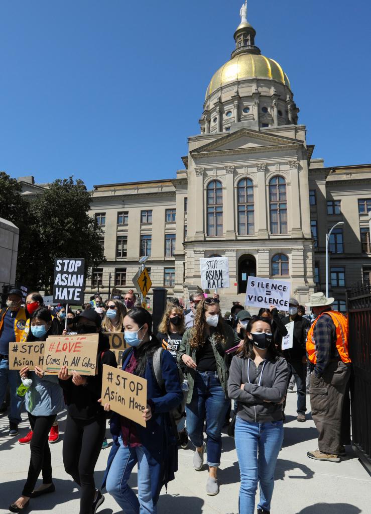 2021年3月20日,人們手持標語在美國佐治亞州亞特蘭大市的佐治亞州議會大廈前舉行集會,抗議針對亞裔的暴力、種族歧視和仇外情緒。新華社