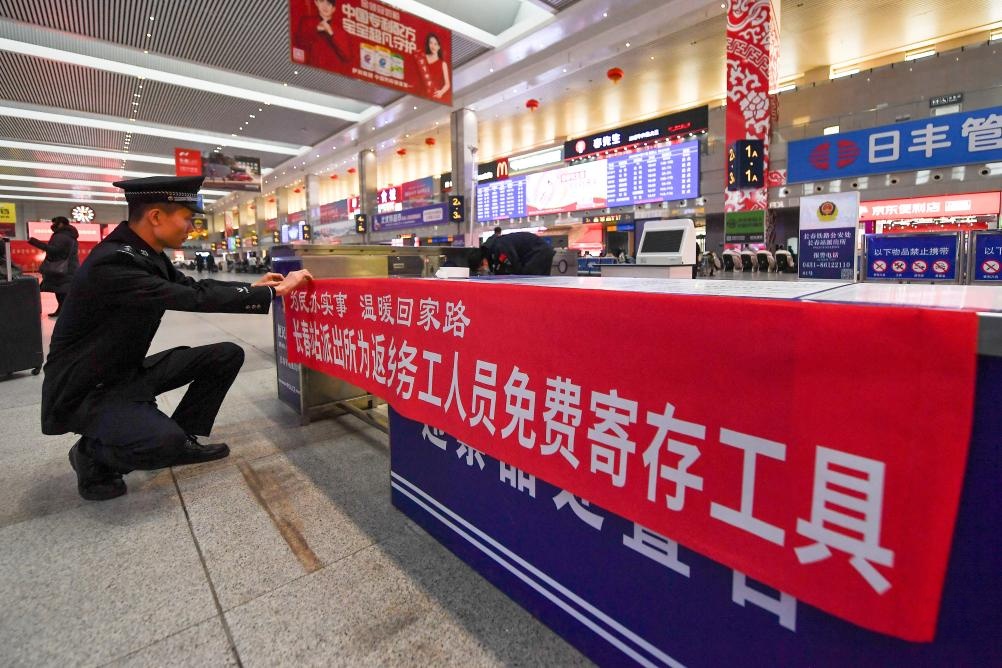 1月14日,在長春站候車大廳,長春鐵路公安處民警設置服務枱,為旅客寄存無法帶走的工具。新華網