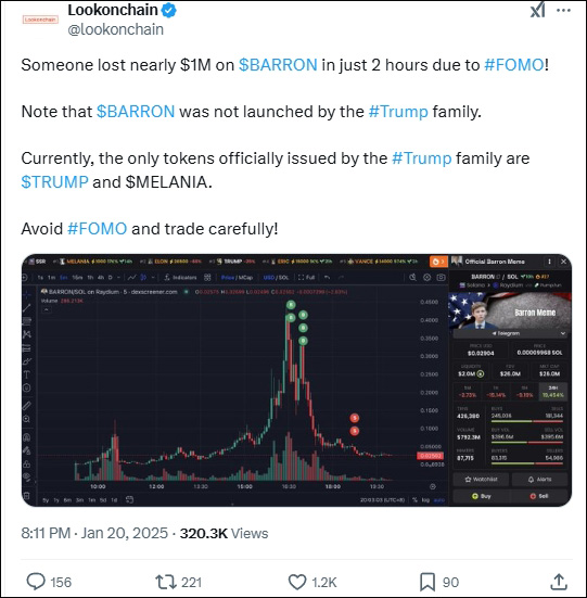 值得注意的是,就在20日當天,一款打着特朗普兒子巴倫·特朗普名號的“巴倫幣”出現在交易市場上,但後來被證實該幣與巴倫毫無關聯,特朗普家族唯一的官方迷因幣只有“特朗普幣”和“梅拉尼婭幣”。
