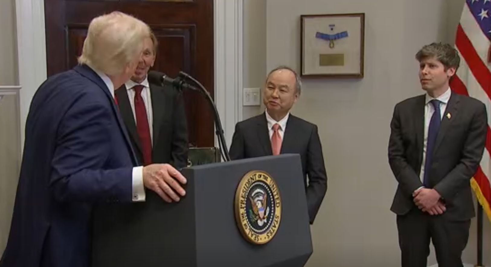 當天,特朗普在白宮宣佈了一項價值5000億美元人工智能重大投資。OpenAI首席執行官奧特曼、軟銀首席執行官孫正義和甲骨文董事長埃裏森也出席了現場。