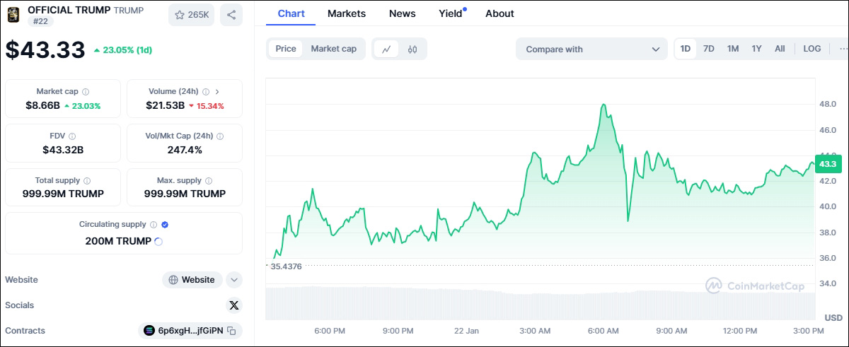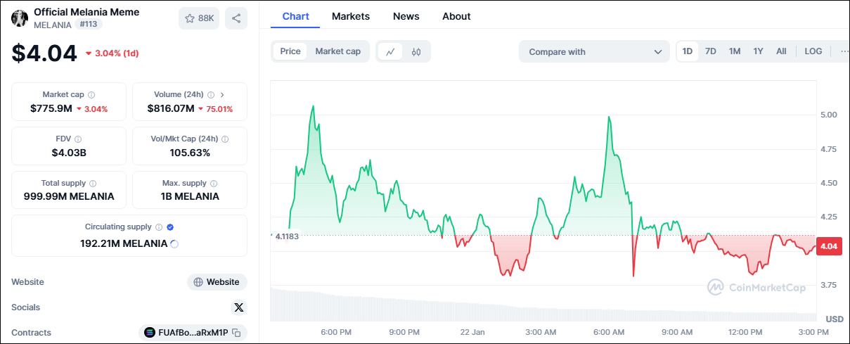 根據加密跟蹤網站CoinGecko 的數據,“特朗普幣”在截至當地時間21日上午的24小時內一度暴跌超過20% ,吐出了發佈之初飆升的部分漲幅——“特朗普幣”18日經歷了從10美元暴漲到74.59美元隨後下跌,經歷過山車般的起伏。“梅拉尼婭幣”的情況類似。同一時期,該幣下跌幅度超過一半。