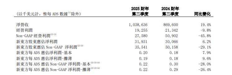 稍早前,新東方對外發布業績報告顯示,2025財年二季度(截至2024年11月30日止3個月)淨營收10.39億美元,同比增長19.4%,但淨利潤僅3193.1萬美元,同比增長6.2%。而經營利潤同比下跌9.8%,降至1925.5萬美元。非公認會計准則(Non-GAAP)淨利潤按年下跌29.1%至3554.1萬美元,經營利潤為2758萬美元,大幅下跌45.8%。