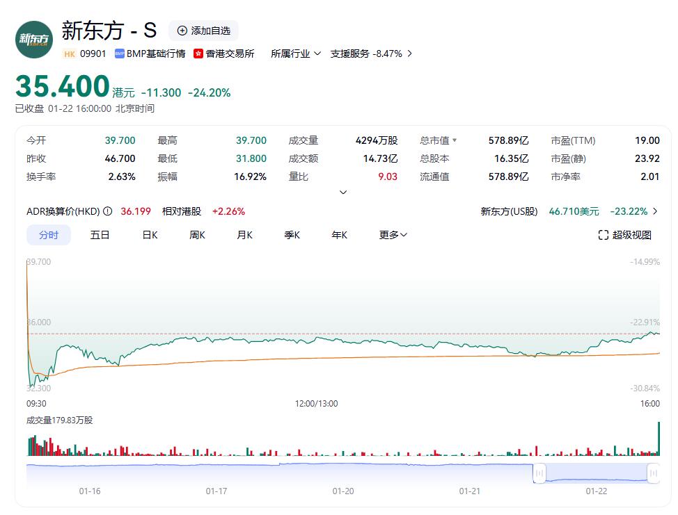 1月22日,港股方面,新東方-S盤中一度跌破30%,收報38.40港元/股,跌幅24.20%。東方甄選則一度跌近9%,收報15.80港元/股,跌幅2.35%。
