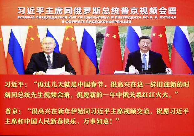 1月21日,中國國家主席習近平在北京同俄羅斯總統普京舉行視頻會晤,兩國元首互致新年祝福。習近平強調,新的一年,我願同總統先生一道,繼續引領中俄關系登高望遠,以中俄關系的穩定性和堅韌性應對外部環境的不確定性,共同促進兩國發展振興,維護國際公平正義。