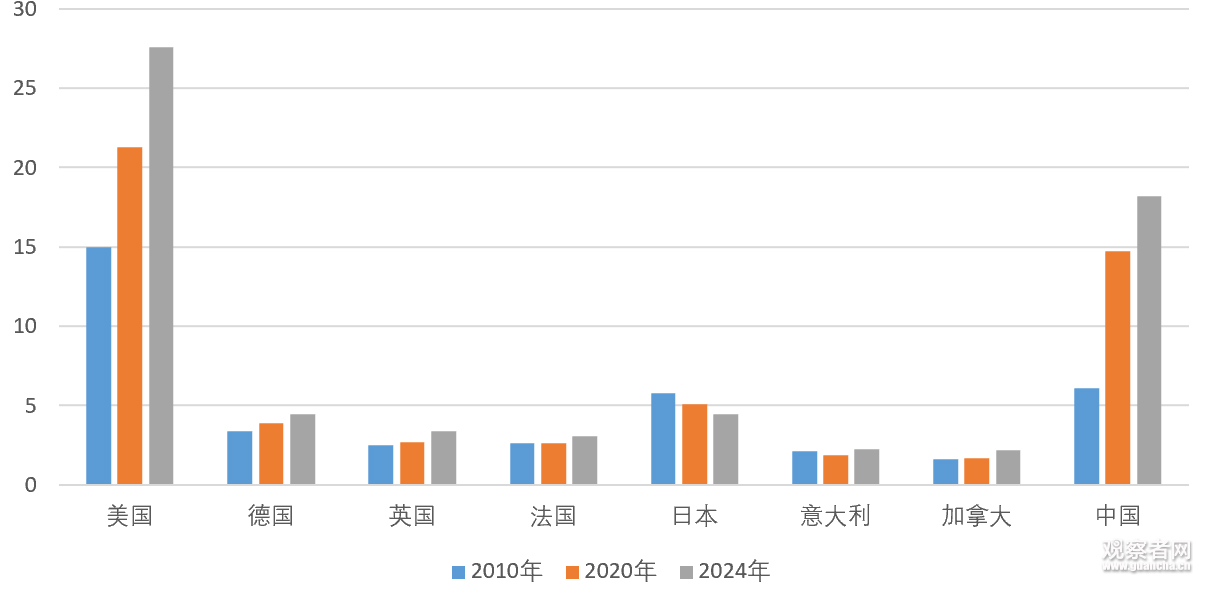 按美元計價的G7國家和中國GDP,從中就能窺見世界經濟格局變動,以及為什麼説“天下苦美久矣”。 圖表來源:作者自制。