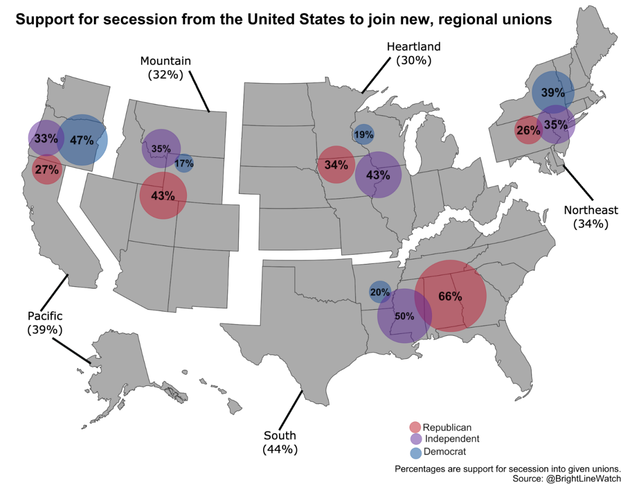 同年的一項另一項民意調查將美國分為五個地理區域,發現 37% 的美國人贊成從他們自己的地區分離出來。44%的南方美國人贊成分離,共和黨的支持率為 66%,而民主黨在太平洋各州的支持率為47%。