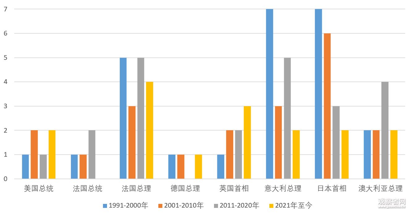 西方主要國家1991年以來每十年更換領導人次數,可見大多數國家出現了近年加速的趨勢。 圖表來源:作者自制。