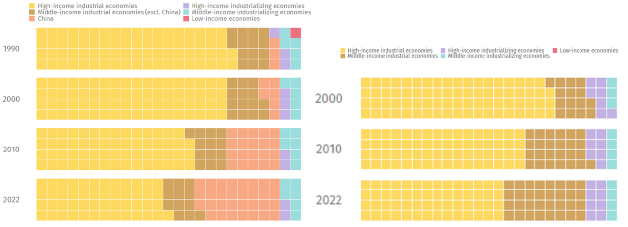 這樣的變化也已經傳導到了生產和出口,根據聯合國工業發展組織所提供的數據,已經實現工業化的高收入國家,其製造業增加值在1990年佔全球份額高達74%,到2000年仍有72%,卻在本世紀加速收縮,到2022年僅有49%。在製造業出口中的份額由2000年的75%收縮至2022年的56%,預計再過幾年同樣將跌破一半份額。