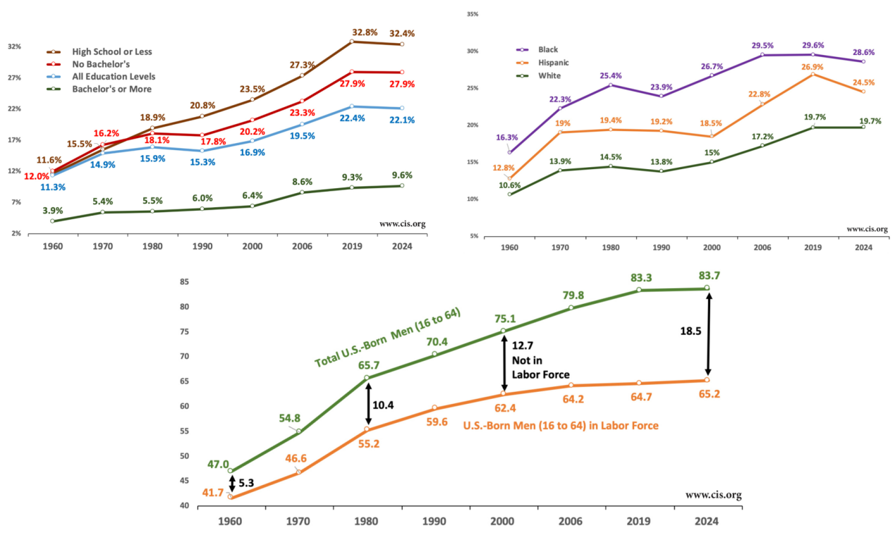 根據美國移民研究中心的統計,美國出生的本土居民正在退出勞動力市場的進程正在加速,適齡(16-64歲)人口未進入勞動力市場的比重,已從2000年的16.9%增加到2024年4月的22.1%。