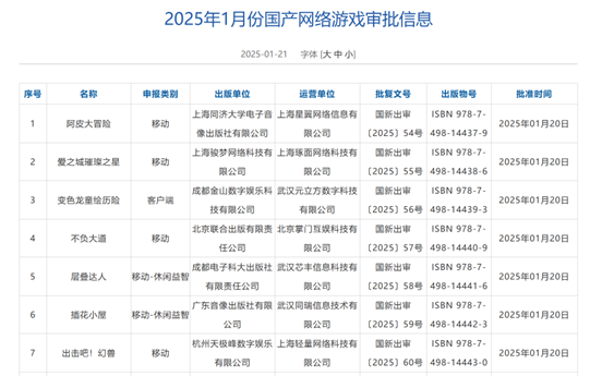 1月21日晚間,國家新聞出版署公佈2025年1月份國產網絡遊戲審批信息,共123款國產新遊獲批。其中包括騰訊旗下的《王者榮耀:世界》,以及愷英網絡、三七互娛、中手遊、中青寶、中國移動、金山軟件等多家上市公司旗下的產品。此外,另有13款進口遊戲獲批,當月新遊總數達到136款。