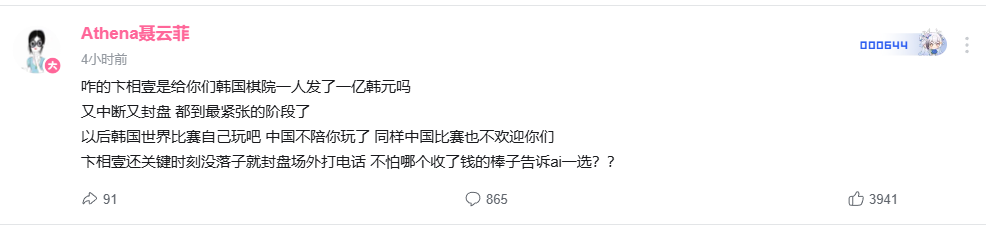 聶衞平的女兒聶雲菲也在社交平台針對此事發聲:咋的?卞相壹是給你們韓國棋院一人發了一億韓元嗎?又中斷又封盤,都到最緊張的階段了,以後韓國世界比賽自己玩吧。