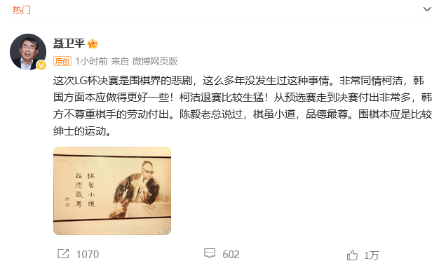 “陳毅老總説過,棋雖小道,品德最尊。圍棋本應是比較紳士的運動, ”聶衞平寫道。