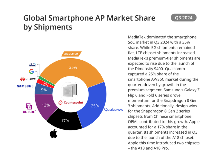 2024年三季度,全球手機處理器出貨數據 圖源:Counterpoint